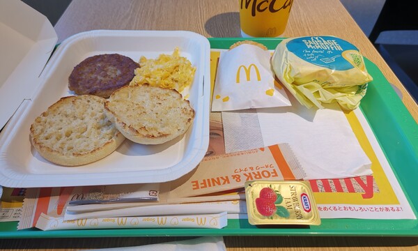 因為中巴8點50分從京都車站出發,所以我們6點半就出門吃早餐。靠近馨樂庭的五条路上,早餐選擇有麥當勞、街かど屋、やよい軒,但人是奇怪的生物,明明7月才在九州吃了印象不佳的麥當勞早餐,今天小花君又提議吃麥當勞,這次更是訝異這滿福堡也縮水太嚴重啦!