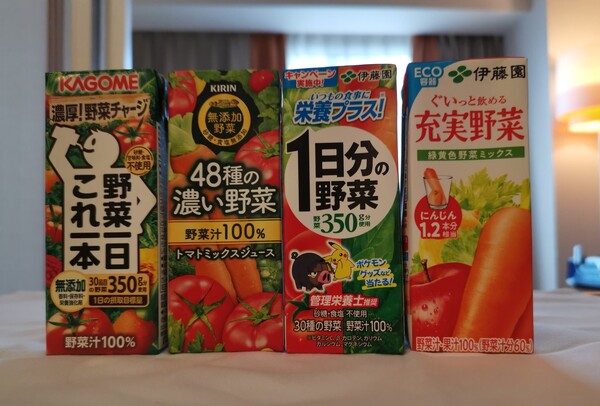 吃完早餐回到飯店,又從小冰箱拿蔬果汁出來喝!出外旅行總覺得蔬果攝取量會不足,所以昨晚在FRESCO特地買了不同牌子的蔬果汁,有KAGOME、伊藤園、KIRIN,一字排開,我的野菜生活美美地!
