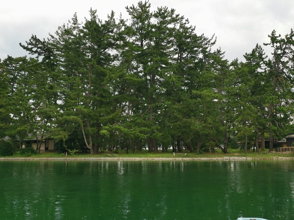 從碼頭看天橋立,可以看到一片松林,這裡的松樹被選「日本の名松百選」,據估計天橋立上大約有8,000棵以上的日本黑松,推測這片松樹林約在3000年前就已經形成。雖然天橋立二邊緊臨海面,但奇特的是,沙洲下方的地下水脈卻是淡水,這裡還有一個稱為磯清水的古井,從古井打出來的水名列「日本の名水百選」。