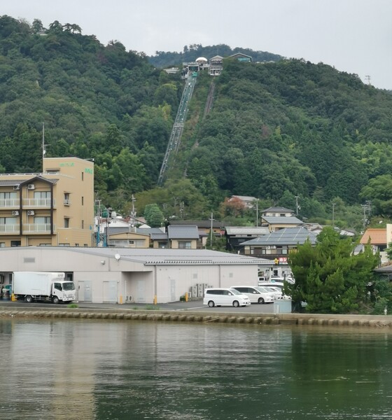 從船上看陸地,很清楚看到前往傘松公園的方法之一就是乘坐纜車,纜車分為車廂式與吊椅式,吊椅隨時可以搭乘,車廂式纜車則15分鐘發車。