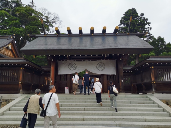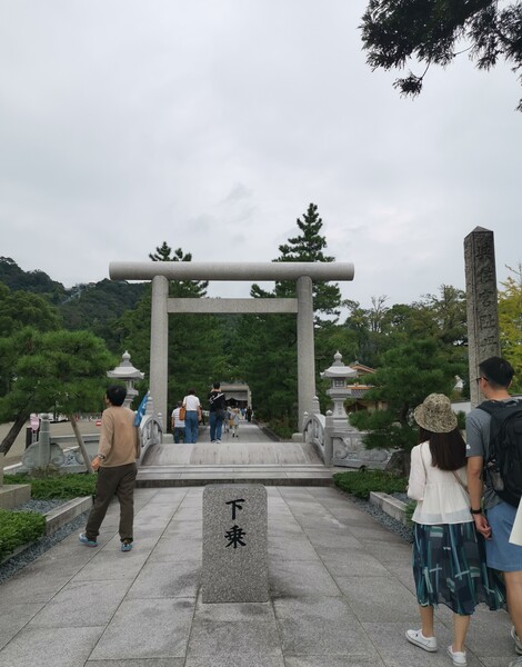 上了岸,往天橋立傘松公園纜車入口方向走會經過已有2500多年歷史,被視為伊勢大神故鄉的「元伊勢籠神社一の宮」,籠神社特別強調「一の宮」,因為這是所有神社中位列最高的社格。籠神社古時稱為「匏宮」,是丹後地區社格最高的神社,祀奉豐受大神,在第十代崇神天皇時期,天照大神曾遷移至此,與豐受大神共同祭祀了四年。直到第11代垂仁天皇時期,天照大神才移往三重伊勢神宮內宮,而豐受大神則在第 21代雄略天皇時期移往伊勢神宮外宮,籠神社同時成為伊勢神宮內宮及外宮的元宮,因此被人們尊稱為元伊勢。兩大神遷往伊勢後,主祭神改為天孫彥火明命,因彥火明命曾乘坐竹編小舟(籠船)前往海神宮,所以宮號改為籠宮,而彥火明命的後代海部氏,也成為籠神社的世襲宮司家族。