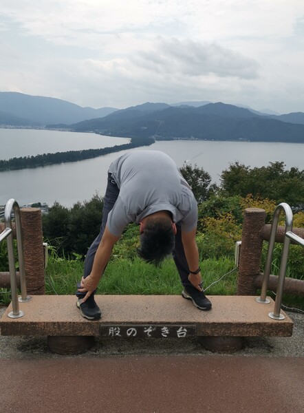天橋立的名字因何而來?據說站在傘松公園「股のぞき」,背對沙洲彎腰從胯下倒看天橋立,天地相反的景色,彷彿一條綿延至天際的橋梁,因而得名,所以這是非常有名的拍照姿勢。