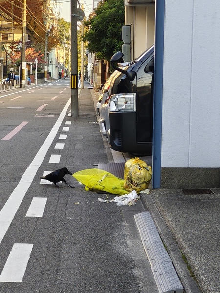 晨間散步時看到有趣的景象,日本沒有垃圾不落地,雖然垃圾放在網袋內,但聰明的烏鴉有辦法扯破網袋。