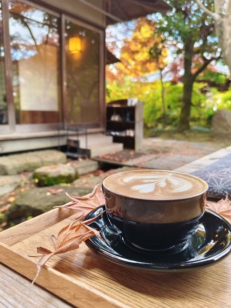 坐在緣廊上享受咖啡。