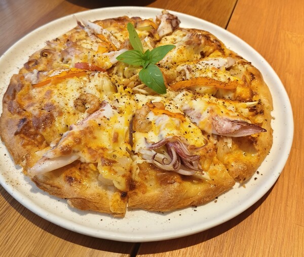 小卷為磺港漁港主要漁獲,所以一次午餐選「貪心咖啡」的小卷pizza