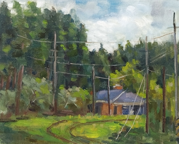 也是後來才知道這幅的取景地是二萬坪車站三角線,那時選這景,主要原因是莫名被吸引,其次是前景綠地、中景房子、背景樹林,加上橫線電線、曲線鐵軌,會是活潑的構圖。