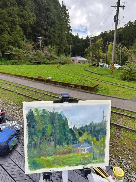 其實寫生旅行前我只知道會去阿里山,但不知道會在二萬坪寫生,對二萬坪非常陌生。不過旅行久了,對周遭風景有種直覺式的敏感度,所以一踏進二萬坪,就知道應該畫山岩節理層次分明的山、火車站、柳杉森林和這裡,回台北後google二萬坪,還蠻開心構圖取景都有畫到重點,不虛此行!