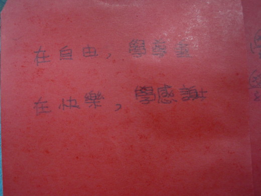 她說應該是<在快樂,學感謝>因為一定是有人給快樂啊!還附帶說:<馬麻---------我很懷疑你耶!你真的是教國文的嗎?>