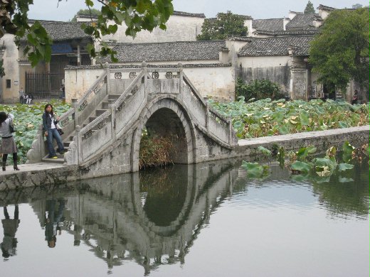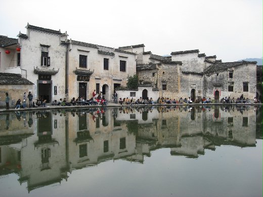走進宏村,首入眼簾的是大型的人工湖~南湖,湖畔邊處處可見大學生認真、專注的畫下這湖光山色;平靜的湖面倒映著天上的白雲,一棟棟青磚瓦舍白牆,躍動於漣漪之中,貫穿湖心的堤壩上拱橋如畫,讓人宛如置身於畫屏中!走進村莊裡的巷弄小徑中,人是依著〞牛腸子〝而行,巷弄邊清澈的小河道,在七彎八柺中,從這一家走到另一家,最後,將家家戶戶緊緊地串聯在一起。這水繞全村,戶戶清泉,不僅給居民在生活上帶來很大的方便,更為消防提供了充足的水源,還具有調解氣溫、保持濕度的功能。為了這條水系,汪姓族人規定:「每天早晨八時前為汲取飲水時間,八時以後才可洗刷。」這樣的用水習慣,延續至今,〞牛腸子〝之乾淨,可見一班!