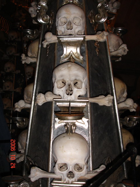 「庫特拉‧赫拉」是離布拉格僅70公里的城市,在14~15世紀是全歐洲最有錢的城市,因有豐富的銀礦,成為皇室鑄造銀幣的主要城市,更在1995年被聯合國文教科組織評鑑為世界文化遺產;其中更以聖芭芭拉教堂為其代表。可是,ERICA較感興趣的卻是『人骨教堂』。在中世紀的波西米亞地區,存在著這樣的公墓教堂,特別是在瘟疫肆虐歐洲的時期更盛之。據說:這座人骨教堂,原是SEDLEC修道院的小禮拜堂,起初是由一群半盲的修道士用人的骨骼所拼湊的裝飾,後來才有藝術家加以修飾設計,共使用4萬人左右的骨骼,組織成十字形聖體畫匣,燈飾等形狀;其主要目的是提醒人們『生命稍縱即逝,而死亡是不可否認的事實』