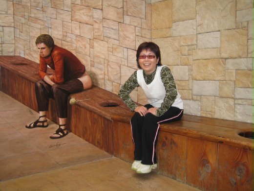 當車子緩緩駛進停車場時,大夥即被龐大的斜塔鐘給吸引了,旁邊更有一排歪歪斜斜的房子,待車子停好,DAVE提醒大家務必去廁所,ERICA隨即帶頭領軍朝廁所前進,一到目的地,哇!怎有人這樣在眾目睽睽之下就……,仔細一看,原來那只是一幅畫啦!哈哈哈,真好玩,差點被騙了!大家趕忙拿起照相機狂拍,各種姿勢都有,笑聲不斷,沒想到上廁所也可以這樣快樂!