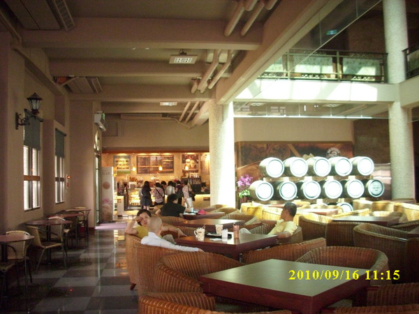 伯朗咖啡館~挑高的空間、橡木酒桶、藤椅沙發、溫馨色系裝潢