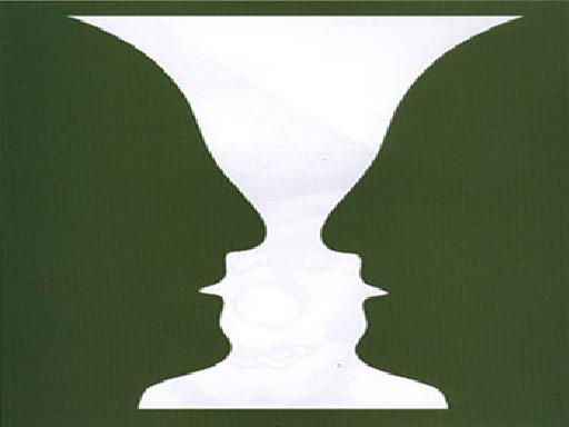 下圖的照片到底是兩個人在對談或是一個杯子,取決於看的人是看白色的部份或是深色的部份。人生是好或壞,不是在於發生的事情是好事或壞事,而是由當事者如何認知。「看法改變、事情也就跟著改變」正如同亨利福特的名言:「你相信你能或是不能,你都是對的。」