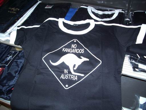 在維也納的一家紀念品商店無意間翻到這件T-Shirt,胸前一隻大袋鼠,寫著「No Kangaroos in Austria(奧地利沒有袋鼠!)」,忍不住當場大笑起來,看來自己的想像還不至於像「艾利的異想世界」那般天馬行空,果不其然有不少外來客弄不清奧地利與澳大利亞。