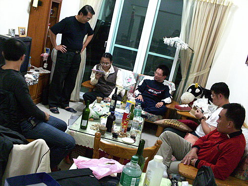 小吃完畢,大夥找個地方坐下來小酌,我提供了五瓶酒,盡皆來自大潤發,按地區順序拿出來:普羅旺斯(Chateau Mistral)、隆河谷(Chateau Dieumacy)、波爾多右岸(Chateau Viramiere St. Emillion)、波爾多左岸(Chateau Maine Grave)、西南Cahor區(Chateau Apogee),酒非好酒,但高朋上座,十分愉快!