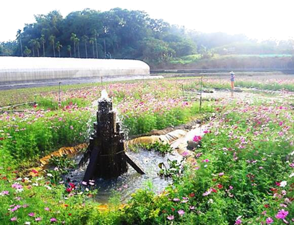 波斯菊映入水中,粉紅搖曳