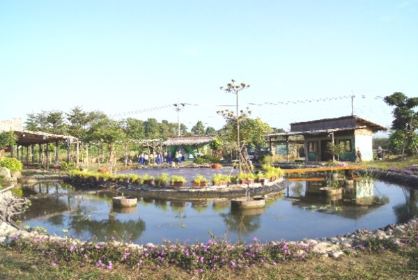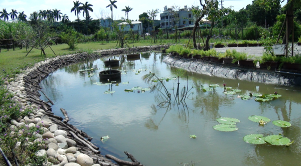 池岸四周定置珍貴的桃花心木枝幹,以穩固岸邊,舞臺上種植三株雞蛋花樹,開花時串串紅豔。池邊一棵樹齡數十年的茄冬樹,風生水起,綠郁搖曳。觀眾席則以夢幻的紫藤樹遮蔭,池裡以檜木桶營造五彩噴泉。水生植物漫長其間,清晨或是黃昏悠然散步,絕對令人心曠神怡。