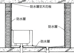 浴廁之防水層必須從底部施作至天花板為止。若是廚房,除底部必須全部施作防水層外,壁面則可視用水位置之高度作局部施作。