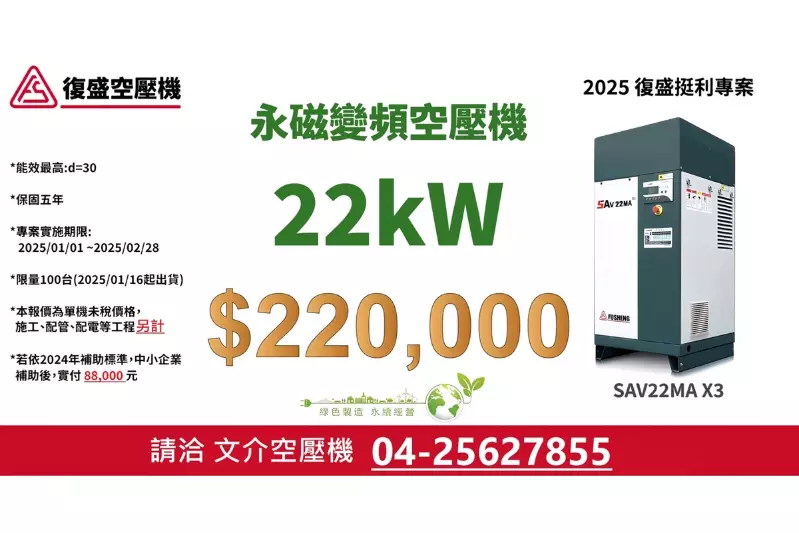 復盛空壓機是文介長期合作的重點品牌,其中主打的SAV-M永磁變頻螺旋式空壓機,以節能高效的設計,特別適用於食品加工、製造業、工具製造等產業。此機型的自動調節運行模式,不僅能有效降低能源成本,還能提供穩定的風量,為生產線提供可靠支持。