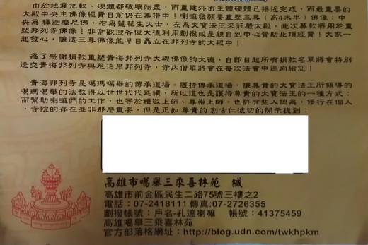 上一則: 文武百尊灌頂、講解、瑪哈嘎拉除障、金剛薩埵度亡法會 2012.05.30-2012.06.03 下一則: 民國101年_本年度喜林苑學會會員大會暨理監事會議將於101.02.12(周日)早上十時召開