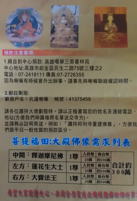 由於地震把軟、硬體都破壞殆盡,而重建外面主體硬體幾乎已經把錢花光了,而最重要的大殿中央主佛像經費目前仍沒有著落!喇嘛發願要重塑三尊(高