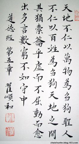 天地不偏私他的仁心,把萬物視為草編的狗,任其自然;聖人不偏私他的仁心,把百姓視作草編的狗,任其自然;天地之間,它就好像個大風箱一般,虛空而沒有盡頭,鼓動它就愈來愈有勁,話多了祇會招來困窘,倒不如默默守著中道而行。