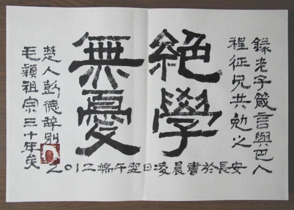 「絕學無憂,唯之與阿,相去幾何?善之與惡,相去若何?人之所畏,不可不畏。荒兮其未央哉!眾人熙熙,如享太牢,如春登臺。我獨泊兮其未兆,如嬰兒之未孩。儡儡兮若無所歸!眾人皆有餘,而我獨若遺。我愚人之心也哉,沌沌兮!俗人昭昭,我獨昏昏。俗人察察,我獨悶悶。澹兮其若海,飂兮若無止。眾人皆有以,而我獨頑且鄙。我獨異於人,而貴食母。