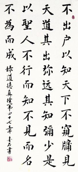 感官是不可靠的,所以人們常被事物的表相迷惑。只有用心去體會「道」才能明白世事的變化不再迷惘。領悟了道,不用出門就能知天下事,不用看窗外就能知天道的運行。反而是那些事必躬親的人,走的越遠,知道的卻越少。所以,聖人不需事事自己做,就能知道其中的奧妙;不需樣樣親眼看,就能將萬物描述正確;順應萬物的本性,不需絲毫造作就能成大功、立大業。
