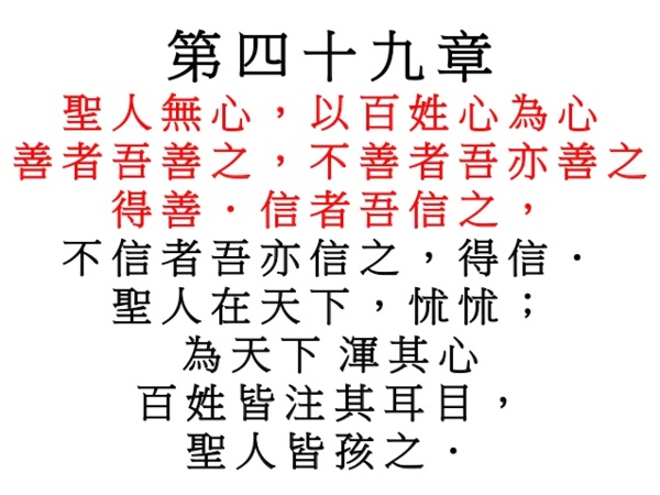 「聖人常無心,以百姓心為心。善者吾善之,不善者吾亦善之,德善。信者吾信之,不信者吾亦信之,德信。聖人在天下,歙歙為天下渾其心。 百姓皆注其耳目,聖人皆孩之。」