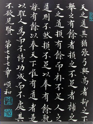 自然之道就好像人們張開弓弦對準目標一樣!目標居高,弓弦下抑;目標在下,弓弦上舉;弦拉過頭了就放鬆一點,弦拉得還不夠就再拉緊一點。自然之道就是這樣,減損有餘的來彌補不足的。人世之道卻往往不是這樣,它竟是減損不足的來奉獻給那有餘的。誰能夠真讓那有餘的拿來奉獻給天下呢!這只有那有道者才做得到。正因如此,聖人他能努力實踐而不恃恩求報,成就了事功而不居執其功,他不願意誇耀自己的賢德。