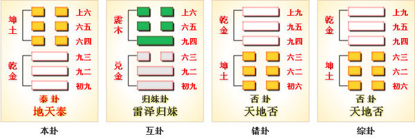 ①泰是本卦標題。 泰的意思是交通和暢,卦象為表示地的「坤」和表示 天的「乾」相疊加,以示陰陽交通和暢。 全卦內容主要講對立面的相互轉化。