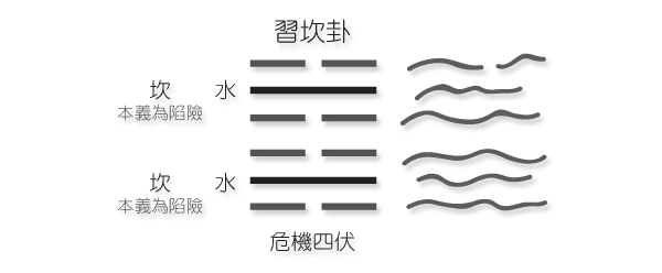 上卦是坎,代表水;下卦也是坎,也代表水,習是重覆,上下都是水,水的本意是陷險,那就是險阻重重了。