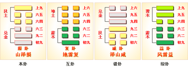 上卦是艮,艮為山。下卦是兌,兌為澤。山在上,澤在下,湖中映照了山的倒影。水在下,潤澤了山上的動物植物,使山更為生意盎然。山是高的,澤是低的,低下的澤幫助高聳的山,使它更為美麗。易學中,上卦是代表別人,下卦是代表自己,所以是損己利人,不為什麼。