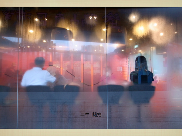 餐廳外下著大雨,一層霞氣附在玻璃上,