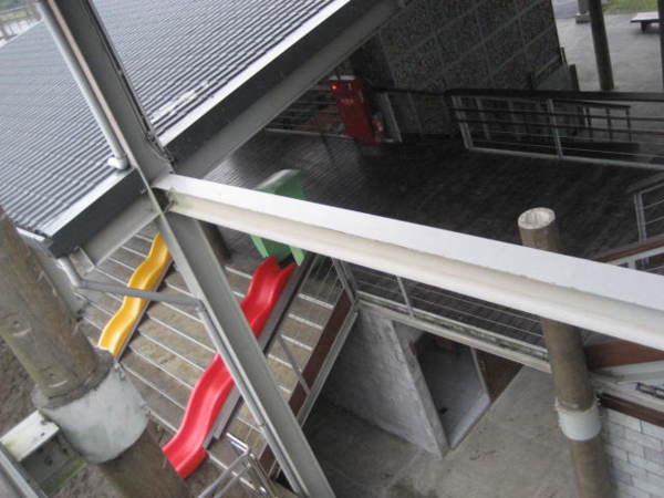 紅色的溜滑梯,閃耀在交錯的欄杆裡。