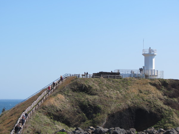 涉地可支(Sopjikoji)位於濟州島東部海岸的一端。「涉地」是這一地區古代時的名稱,「可支」是濟州島方言,意思是向外突出的地形。這片海岸岬地因為作為韓劇《ALL IN》中的場景而變成熱門景點。矗立在坡地上的白色美麗教堂、修女院建築十分顯眼,具有歐洲風味,遠遠地就能吸引住眾人的目光。 涉地可支一端有燈塔,在通向燈塔的路上有防風用的石牆。石牆內是油菜田,每年四月,你就會看到最耀眼的一片黃色。通往燈塔的石階有欄杆扶手,很輕鬆地就能登上。扶欄而立,涉地可支海岸的風景便盡收眼底。