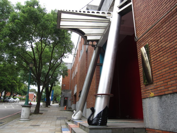 離開光廊邁上陽關道,經音樂廳門口。黑白天鵝守護的「迴旋曲」為音樂廳入口意象,作者董振平。