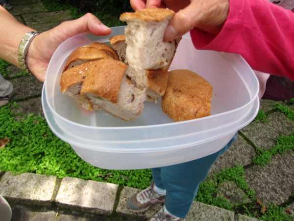 這裡佈滿原生植物景觀,老樹濃蔭、綠意盎然,桂枝在此分切喜餅,均霑同事結婚之喜氣;第二站是電影與新媒體學院旁的花園餐廳,歇腳聊天,品嚐蔡薏帶來的多口味餅乾;途中俯瞰關渡美景之際,團長家的自製麵包直讓大夥讚不絕口。