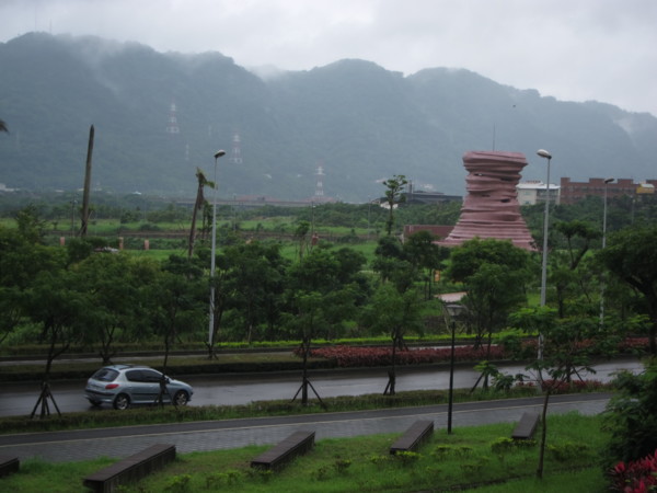 木棧道上清晰望見遠處煙嵐籠罩下的綠野巍巍矗立一件巨碩作品