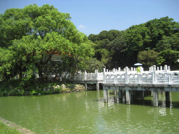 白色九曲橋,矗立湖水上,曲徑迴廊,趣味橫生。