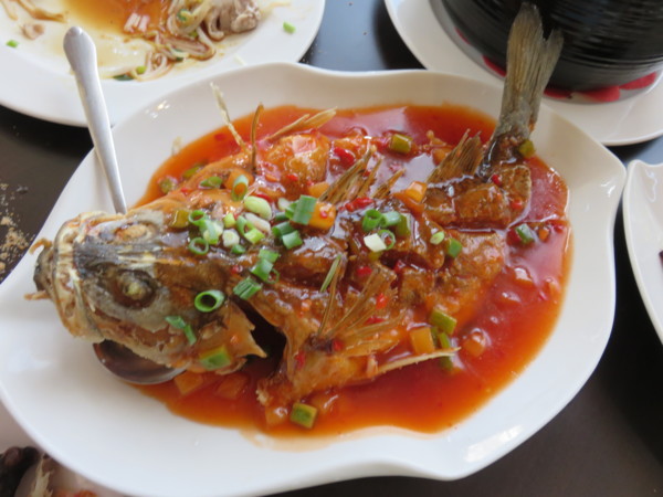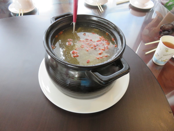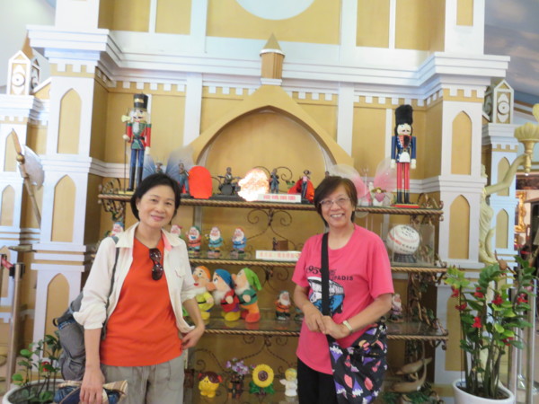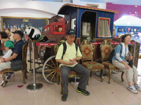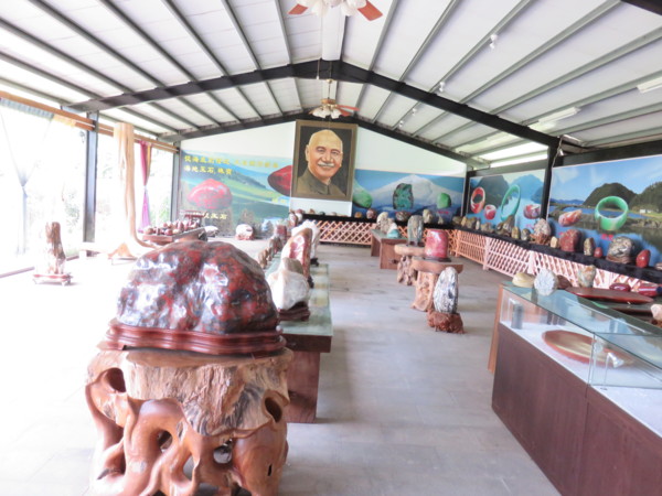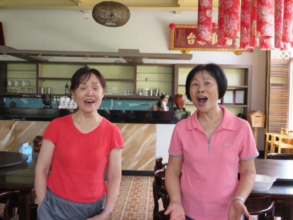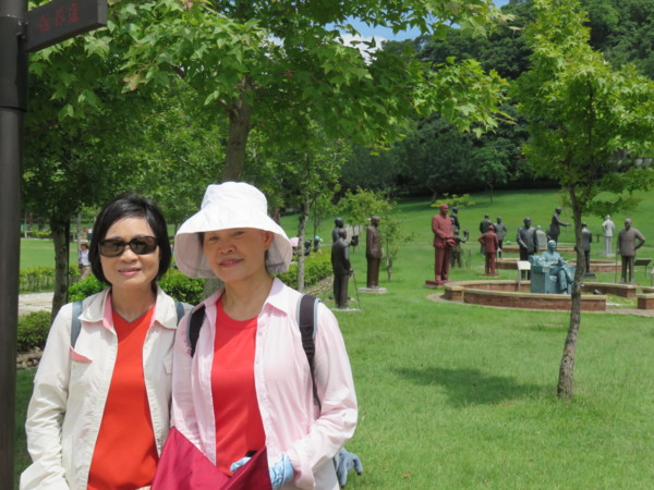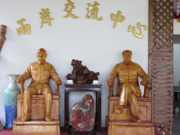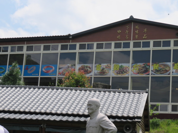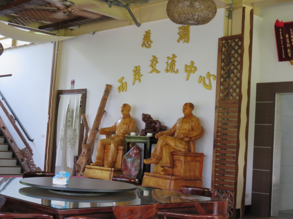 慈湖景觀台餐廳在雕塑公園一隅的小小山丘上,餐廳裡可觀看整個雕塑公園,故名為景觀台餐廳,也是今天笑嘻嘻團的午膳地點。餐廳除供餐外,還兼賣玉石工藝品,但最特別的是把蔣故總統與毛澤東的木雕像並列,並冠以「慈湖兩岸交流中心」,適巧桂枝與秀秀第二天即將隨著台電合唱團到北京比賽,餐後兩位以比賽曲「也是人生」與「月亮代表我的心」獻給大家,大家聽後都覺得此行「反攻大陸」一定成功,讓我們拭目以待。