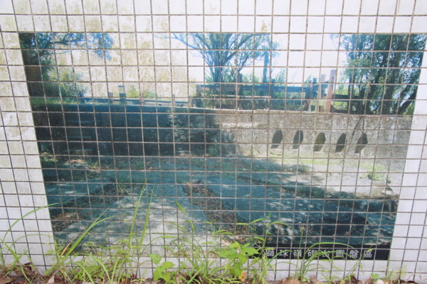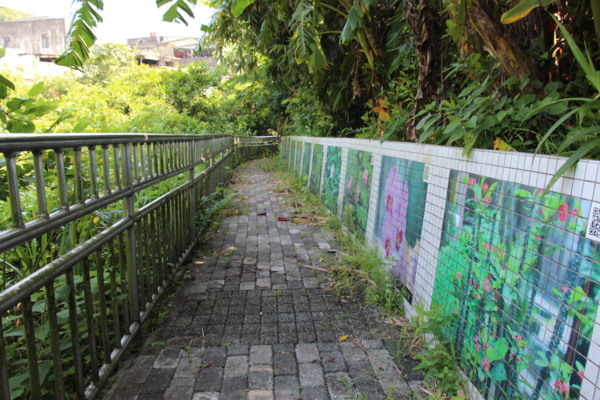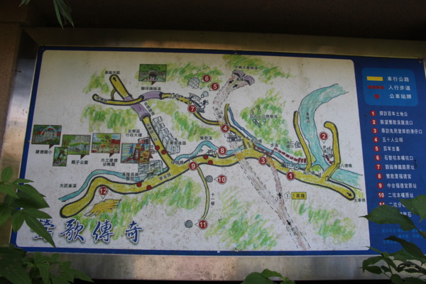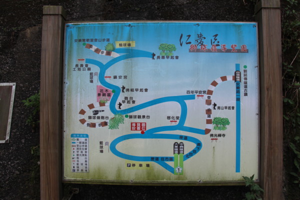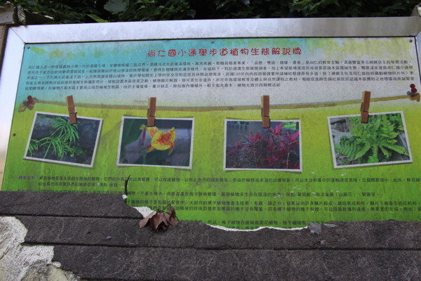 立於尚仁國小旁,植物解說廊道的地圖,清楚呈現今日行程的部分路線(2-4)。從1-12個紅點,仍有我們可以再探的其他。鶯歌傳奇是指基隆河支流鶯歌溪,此國小正為河、溪環繞。7是劉銘傳鐵路線(今八德路),可通獅球嶺隧道,但如今已是車道,暑天不宜。