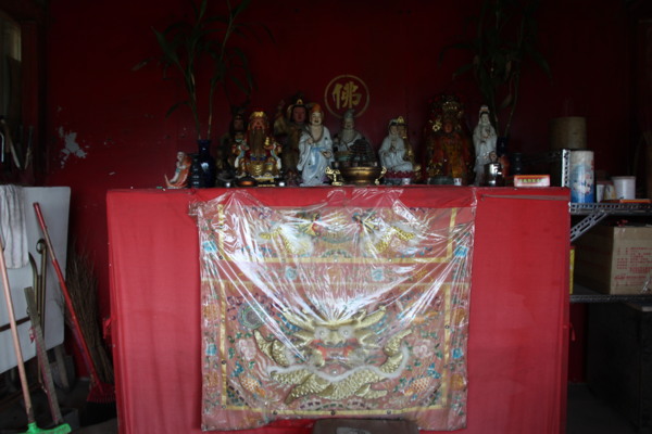 途經一開放式神桌,各類需求的神祇齊聚一堂:觀世音、媽祖、濟公、土地公、九天玄女(商朝祖母),一派和諧。