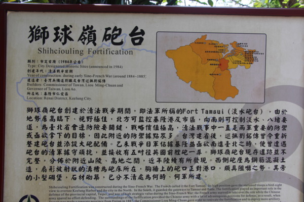 三級古蹟。獅球嶺砲台與隧道都是清代劉銘傳自強建設在台重要政績。中法戰爭(台人稱西仔反,法蘭西人的造反)時被攻陷,參與此役的台籍士紳為霧峰林家下厝的林朝棟,其孫女林雙彎是第一屆北一女少數台籍校友。
