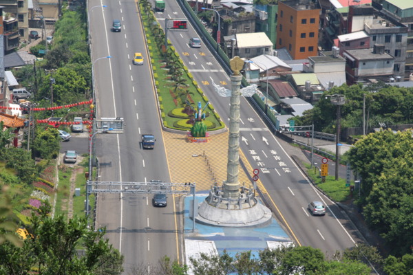 下望一號高速公路起點的紀念柱,上有梅花圖案。