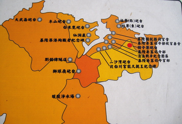 基隆所有砲台:從基隆港往裡算,左有大武崙、木山、白米甕、獅球嶺;右有社寮東西、槓子寮、二沙灣(海門天險)砲台。可見獅球嶺砲台位置已是最後防線。中法戰爭時,前方砲台也已經一一淪陷。