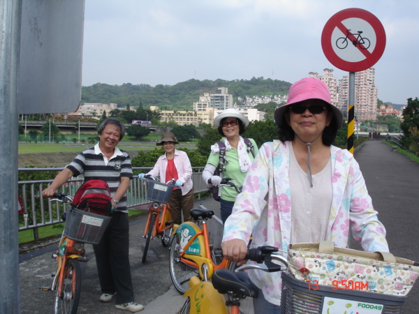 早上一行十六人在動物園站準時集合,掩不住雀躍之情,淑娟意外現身帶來驚喜,雖稍嫌虛弱,但是神采依舊,可見恢復得不錯,可喜! 美中不足的是,因為淑娟和吳芳沒騎過單車,再加上美雲的悠遊卡意外被鎖卡,無法加入鐵騎的行列,只好三人行,約好在公館會合一起用餐。