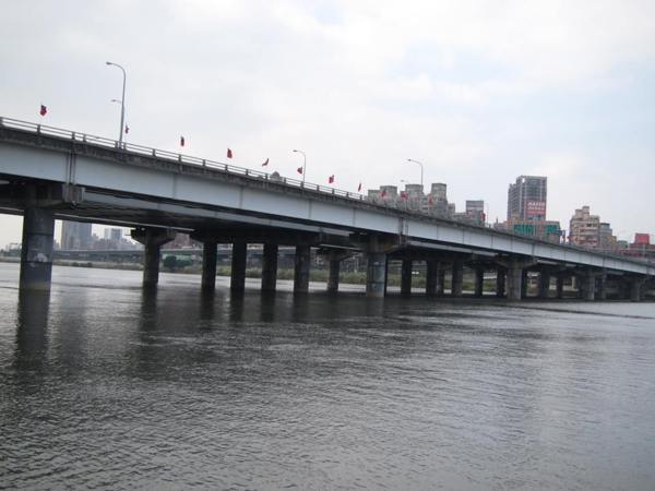 台北大橋上國旗飄揚。這座水泥橋在1969年完工通車之前原是座鐵橋。