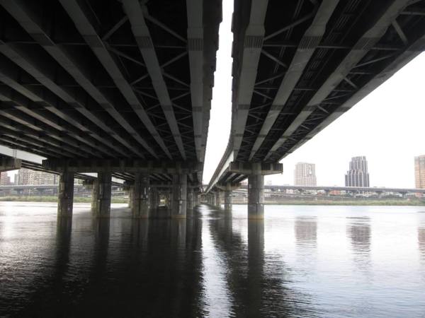 台北大橋的橋墩在淡水河瀲灩波光中呈現沉穩厚重的倒影。在早期大橋頭的大龍峒和大稻埕都要靠台北橋來輸送來自橋尾的三重埔以及中南部的人力和物資,所以大橋之名曾在外鄉人的心中留有深沉的感情記憶。