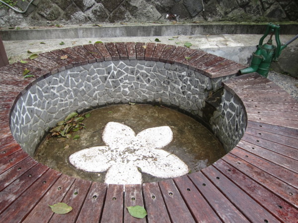 終點休息站 芭樂 毛豆 蓮霧....逐項有.旁邊有把手壓汲水機 水槽裡貼上白色大櫻花.